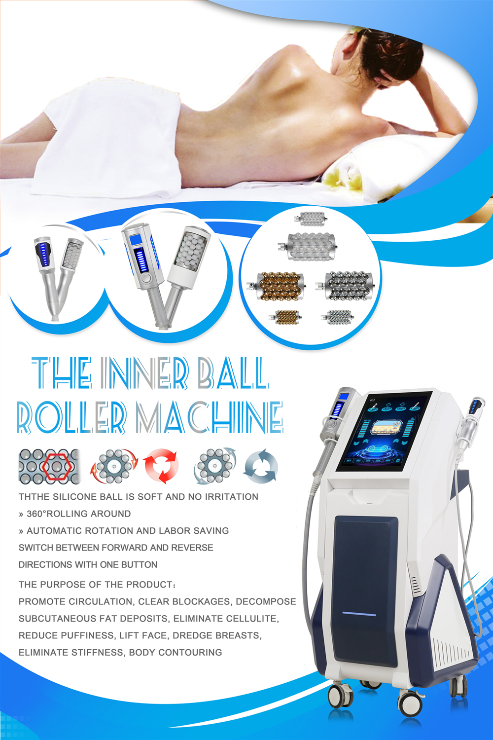 As the ball rotates and exerts pressure on the skin, it produces a "pulsation compression" effect, realizing continuous push-pull kneading reciprocating motion, and the tissue will experience some pressure And lifting action, will not squeeze or damage the skin, the tissue is exerted pressure to stretch the cells to naturally and deeply stimulate cell activity, blood flow and oxygenation, fat deposits are pressurized and thus loosened to finally decompose, reducing cellulite and Removes cellulite; also exerts pressure on deep muscle groups to fully soften and stretch, thereby reducing muscle stiffness and soreness, accelerating metabolism,eliminating stagnation and fluid accumulation, conditioning tissues and re-firming skin tissues, reshaping your body. It can also stimulate fibroblasts, increase the production of collagen and elastin, increase blood flow and increase oxygen.