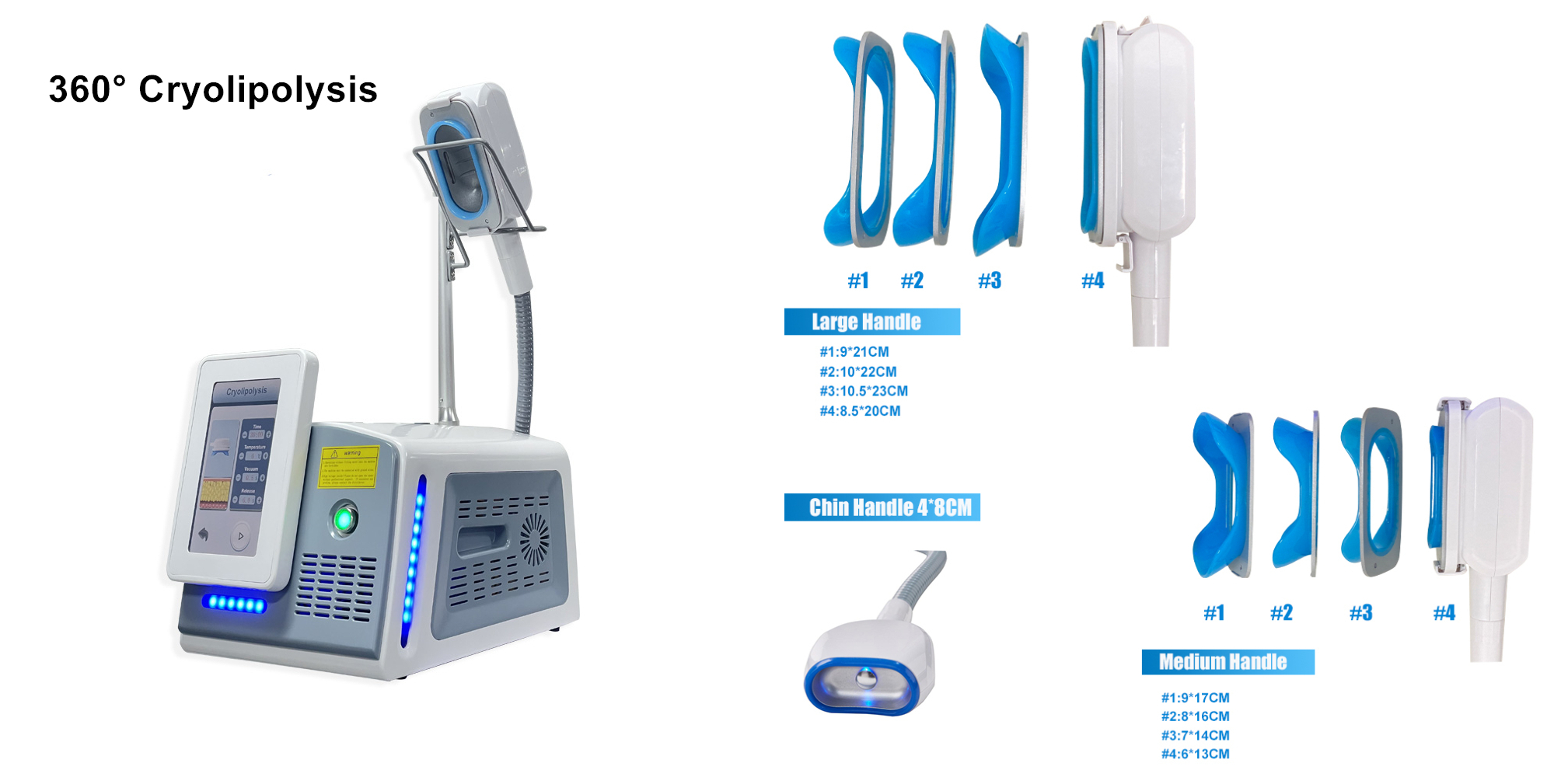 | Cryo handles | 360 ° big handle with 4 cups 20*8.5cm 21*9cm 22*10cm 23*10.5cm 360 ° medium handle with 4 cups 13*6cm 14*7cm 16*8cm 17*9cm double chin handle 8*4cm |